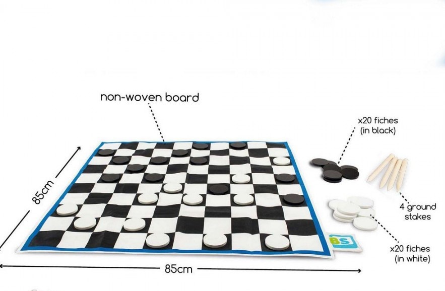 Dammen XL, is dammen op een groot stevig doek 85x85. De doos bevat 20 houten zwarte en 20 witte damschijven, een dambord-doek, een katoenen opbergzak en 4 grondstekers. Je kan dit spel makkelijk meenemen en heerlijk buiten spelen.