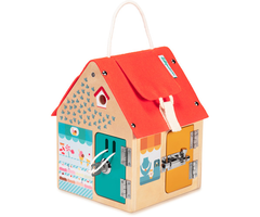 Pas op...!! Er loopt een slimme inbreker rond. Ga jij snel kijken of alle sloten van het huisje vergrendeld, op slot zijn. Of ben jij de handlanger van de inbreker en open jij de sloten voor hem? Dit vrolijke kleurige houten huisje laat kleuters op ludieke wijze kennismaken met verschillende sluitsystemen en stimuleert de verbeelding. Met handvat zodat je het huisje over mee naar toe kan nemen.
