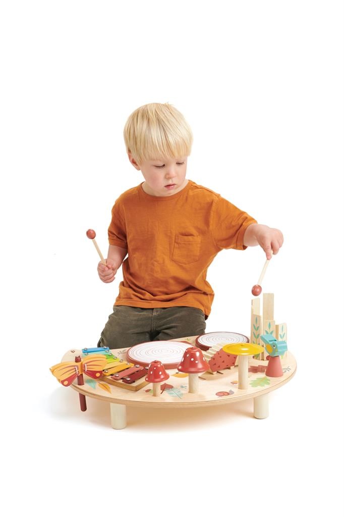Je kan niet jong genoeg met muziek kennis maken. Schuilt er in jou een muzikant in de dop? Maak kennis met verschillende muziekinstrumentjes op deze gave muziektafel, helemaal in een bosthema. Deze muziektafel is tot in de kleinste details uitgewerkt: de drums zijn boomstammen, de stekels op de rug van de egel doen dienst als guiro, fluit op de vogel, er is een xylofoon & windgong en de bellen zijn paddenstoelen. Gegarandeerd veel muziek/speelplezier!!