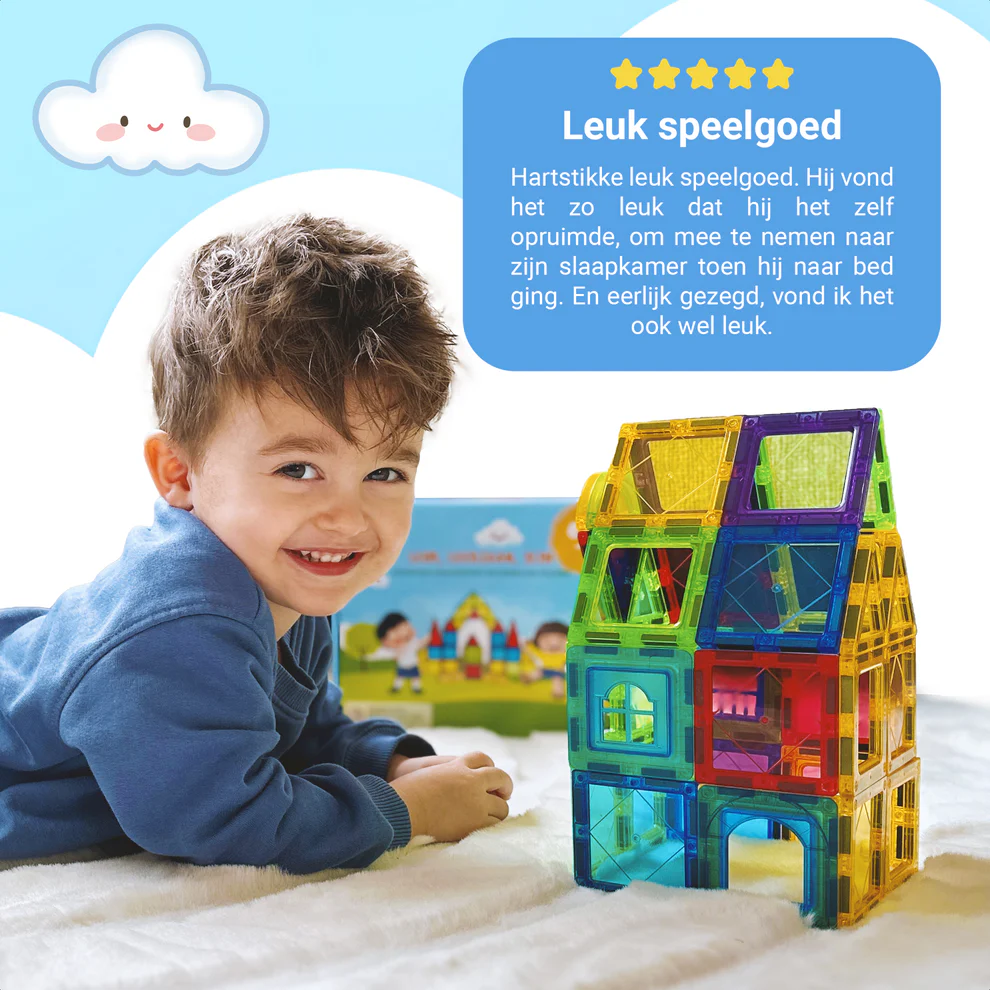 Een van de grootste voordelen van magnetisch speelgoed is het stimuleren van creativiteit en fantasie van kinderen. Kinderen kunnen met onze magnetische bouwstenen verschillende vormen en structuren bouwen, wat hun verbeeldingskracht enorm aanwakkert. Een huis, auto of zomaar een vorm in prachtige kleuren, dat kan allemaal met Gladi. Daarnaast bevordert Gladi de motorische ontwikkeling, omdat kinderen hun hand-oogcoördinatie, hun logisch denken, inzicht en fijne motoriek specifiek trainen tijdens het bouwen.