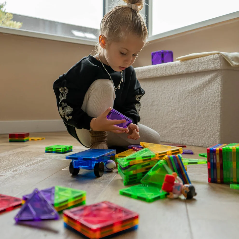 Een van de grootste voordelen van magnetisch speelgoed is het stimuleren van creativiteit en fantasie van kinderen. Kinderen kunnen met onze magnetische bouwstenen verschillende vormen en structuren bouwen, wat hun verbeeldingskracht enorm aanwakkert. Een huis, auto of zomaar een vorm in prachtige kleuren, dat kan allemaal met Gladi. Daarnaast bevordert Gladi de motorische ontwikkeling, omdat kinderen hun hand-oogcoördinatie, hun logisch denken, inzicht en fijne motoriek specifiek trainen tijdens het bouwen.