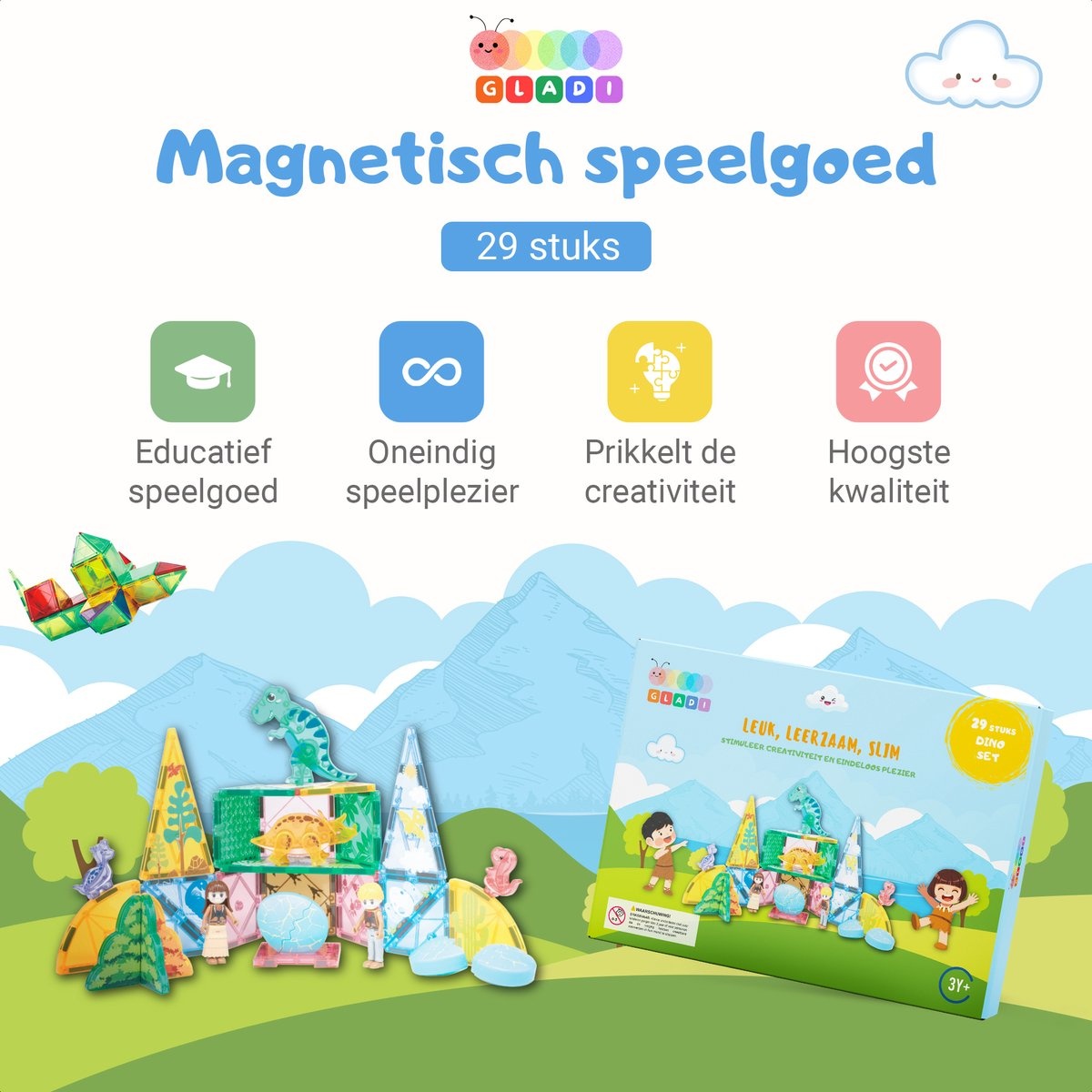 Een van de grootste voordelen van magnetisch speelgoed is het stimuleren van creativiteit en fantasie van kinderen. Kinderen kunnen met onze magnetische bouwstenen verschillende vormen en structuren bouwen, wat hun verbeeldingskracht enorm aanwakkert. Een huis, auto of zomaar een vorm in prachtige kleuren, dat kan allemaal met Gladi. Daarnaast bevordert Gladi de motorische ontwikkeling, omdat kinderen hun hand-oogcoördinatie, hun logisch denken, inzicht en fijne motoriek specifiek trainen tijdens het bouwen.