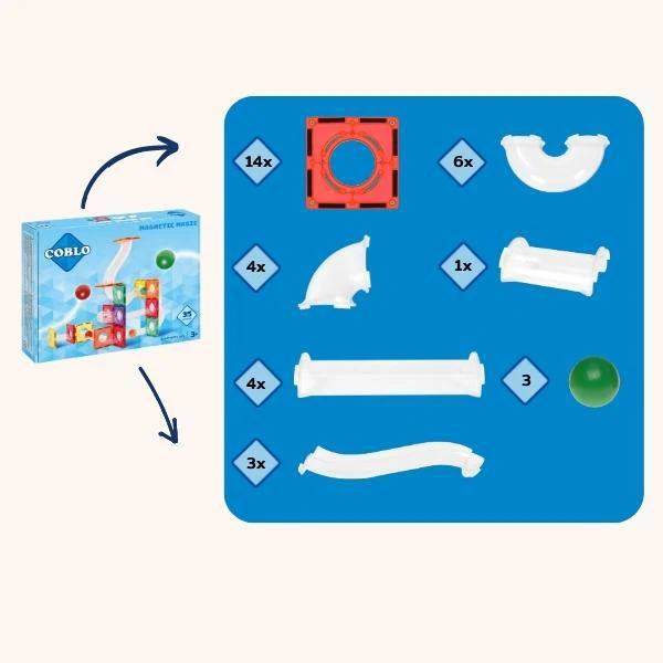 De Coblo Knikkerbaan is een van de nieuwe bouwsets van Coblo. Deze Coblo uitbreidingsset bestaat uit 35 onderdelen waarmee kinderen hun Coblo Classic basis set om kunnen toveren tot een knikkerbaan. En wanneer je de Coblo knikkerbaan 100 stuks al hebt, kun je deze nog groter maken met deze uitbreiding. Kinderen zetten zelf de knikkerbaan in elkaar en deze kan iedere keer weer anders zijn.
