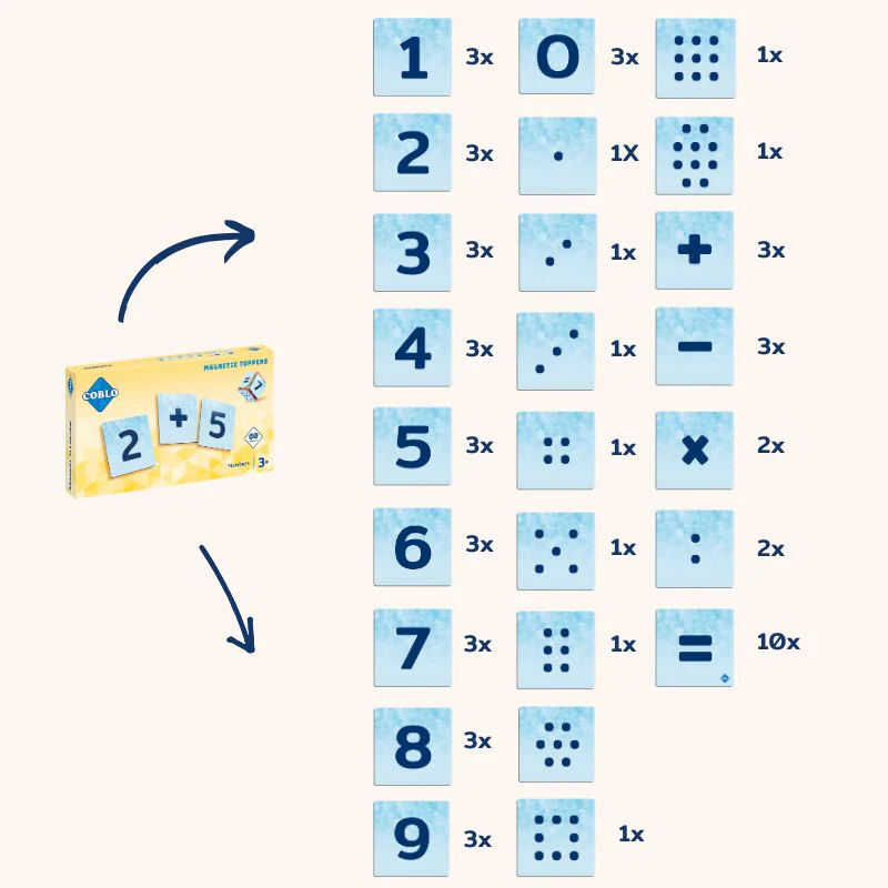 De magneet toppers hebben het formaat van een Coblo steen en door de zwarte laag aan de onderkant (met magneetdeeltjes) klikken kinderen de magneet toppers makkelijk op de Coblo stenen; deze passen precies op de Coblo stenen. Dit maakt spelen met Coblo nog leuker, creatiever, veelzijdiger en leerzaam. De magnetische cijfers hebben een vrolijke kleur om veel plezier mee te maken!
