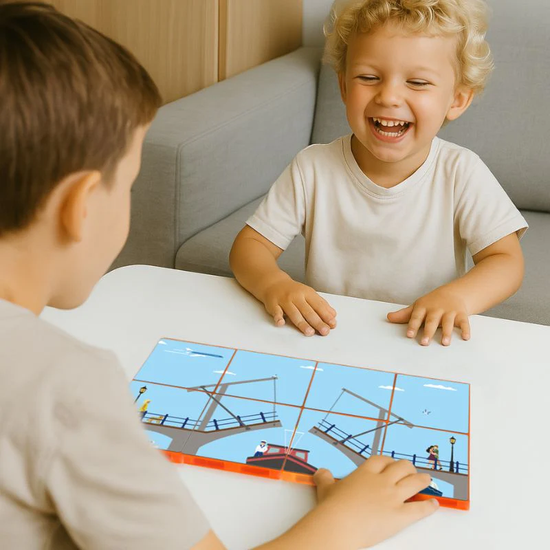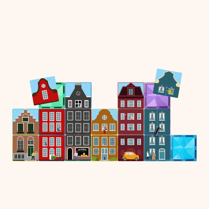 Elke topper toont een kleurrijke afbeelding die kinderen inspireert om te bouwen en de juiste kaartjes bij elkaar te zoeken als een soort van puzzel om tot een mooie stad te komen. Met hier en daar een grappig detail, is elke puzzel niet alleen leerzaam, maar ook verrassend leuk. De magnetische toppers stimuleert kinderen om te ontdekken, verbanden te zien en op een educatieve manier te spelen. Spelenderwijs leren kinderen over typisch Nederlandse architectuur en het stadsleven! De stevige magneetkaartjes blijven goed zitten en zijn perfect afgestemd op kleine kinderhandjes. Maak deze perfect zoals op de voorbeeldkaarten is weergegeven of combineer juist op een andere manier zodat je tot nog innovatievere, kleurrijke grachtenpandjes komt.