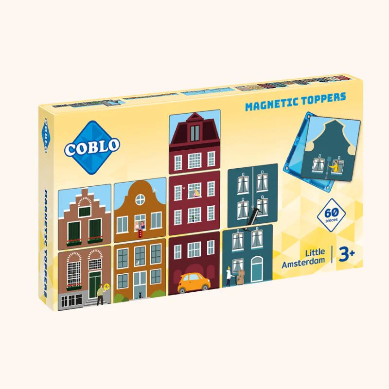 De magneet toppers hebben het formaat van een Coblo steen en door de zwarte laag aan de onderkant (met magneetdeeltjes) klikken kinderen de magneet toppers makkelijk op de Coblo stenen; deze passen precies op de Coblo stenen. Dit maakt spelen met Coblo nog leuker, creatiever, veelzijdiger en leerzaam. De magnetische Amsterdam toppers hebben een vrolijke kleur om veel plezier mee te maken!