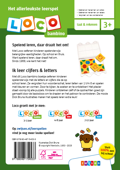 Kijk, zoek en ontdek met dit Loco bambino oefenboekje. Kinderen vergroten hun woordenschat, leren tellen van 1 t/m 6 en spelen met kleuren en vormen. Een goede voorbereiding voor school. Met Loco oefenen kinderen helemaal zelf. Ze maken de opdrachten en controleren of ze opdrachten goed hebben gemaakt door de basisdoos om te draaien en het bolletjespatroon te controleren. Plezier staat voorop met dit vrolijke oefenboek met mooie illustraties van Dick Bruna.