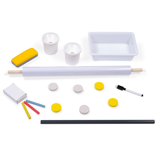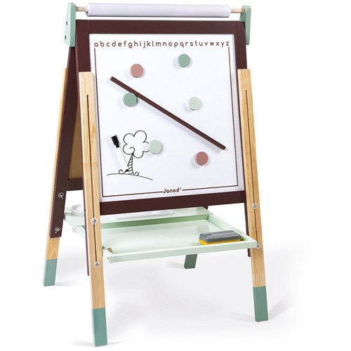 Houten speelgoed met 6 magneten, 10 krijtjes, 1 droge uitwisbare stift, 1 rol.papier, 1 wisser en 1 magnetisch liniaal... Het schoolbord is in de hoogte verstelbaar van 91 tot 126 cm. Schrijfoppervlak: 47 x 47,5 cm.. Erg praktisch : opvouwbaar bord voor een makkelijke opberging.