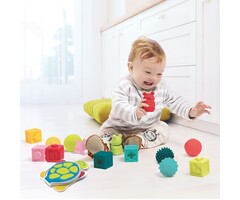 Het speelgoed is gemaakt van hoogwaardig, geurloos plastic (100% PVC) en is gemakkelijk bestand tegen de tijd en ruwe behandeling. Speciaal ontworpen om te verkreukelen, zodat de baby zich niet bezeert als hij op de blokken valt. Baby kan dit speelgoed ook gebruiken om gevoelig tandvlees te kalmeren tijdens het doorkomen van tandjes.