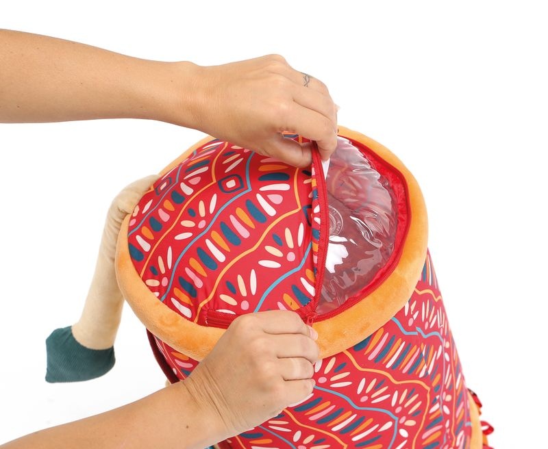 Geschikt voor kinderen vanaf 6 maanden. Afmetingen: 45 cm. Diameter: 27 cm. Samenstelling: 100% polyester. De huls is machine wasbaar op koude temperaturen. De buis is wasbaar met een vochtige doek.