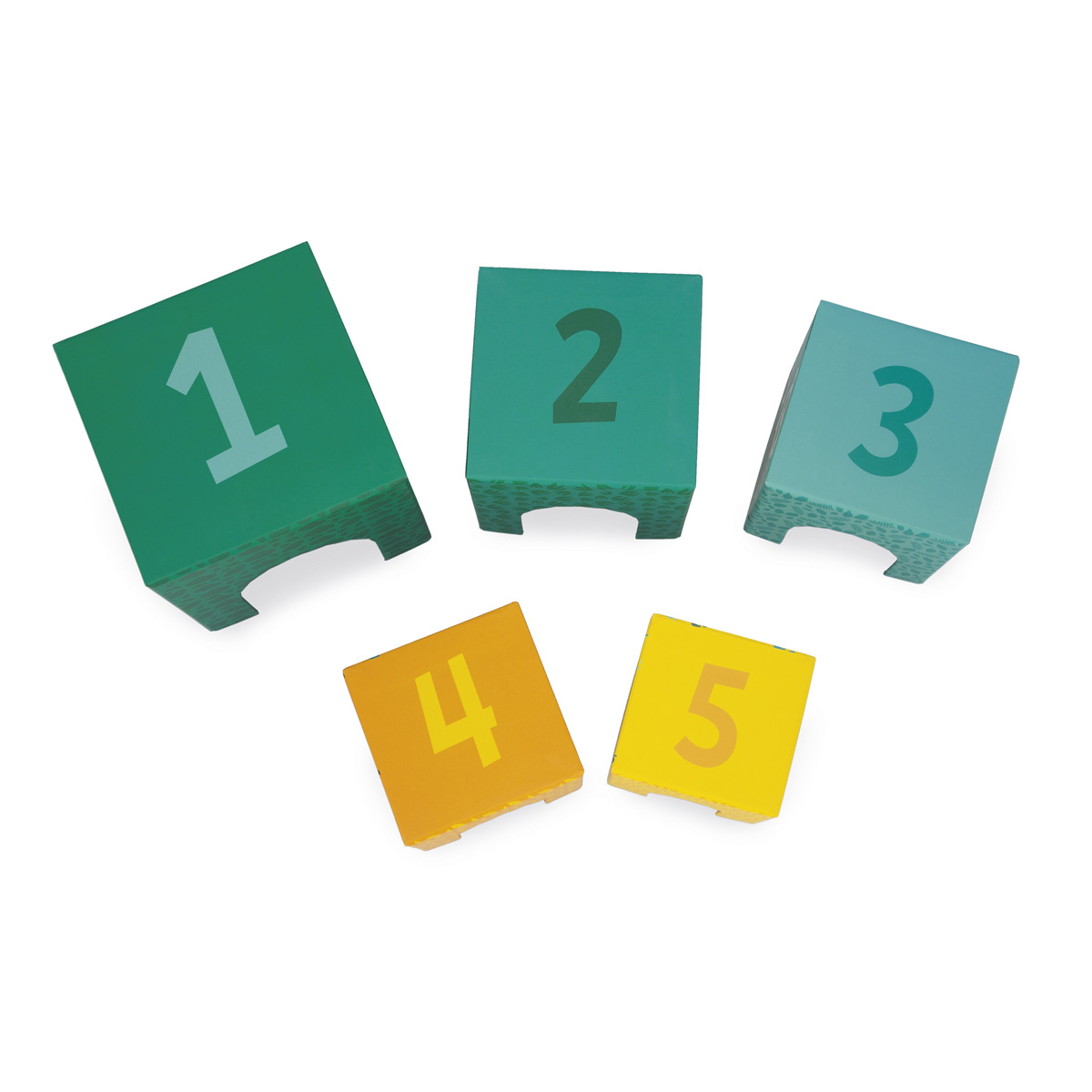 Ze kunnen beginnen met het stapelen van de kubussen van groot naar klein om de piramide opnieuw op te bouwen. Elke kubus stelt een dier van een andere grootte voor: de lemur, die groter is dan de papegaai, zit natuurlijk op een lager blok. Om ze te helpen de weg te vinden, zijn de kubussen genummerd van 1 tot 5. En om spelenderwijs te leren tellen, toont elk geïllustreerd vlak het juiste aantal dieren dat overeenkomt met het nummer: kubus nummer 5 toont bijvoorbeeld 5 kikkers! En dat is nog niet alles! Nu is er het memoryspel: de kleine houten dieren kunnen door het gat aan de voorkant in hun kubussen worden geschoven. De taak van het kind is om het juiste hol voor elk dier te vinden en het erin te verstoppen!