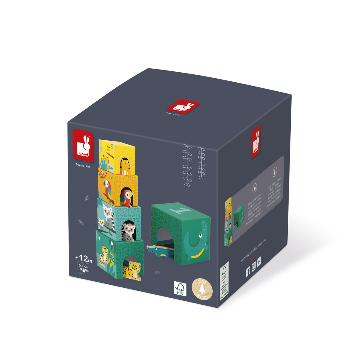 De jungledieren zijn begonnen aan een spelletje verstoppertje! De krokodil, de jaguar, de maki de papegaai en de kikker hebben zich verstopt in hun eigen holen. Met deze mooie vierkante kartonnen piramide van 5 kubussen kunnen baby's vanaf 12 maanden verschillende manieren ontdekken om te spelen!